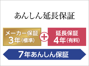 あんしん延長保証 標準の保証期間は3年ですが、さらに4年間の延長保証(有料)にご加入いただくことで、7年間の長期にわたりメーカー保証を受けることができます。大切な製品を長く安心してお使いいただけるおすすめのプランです。