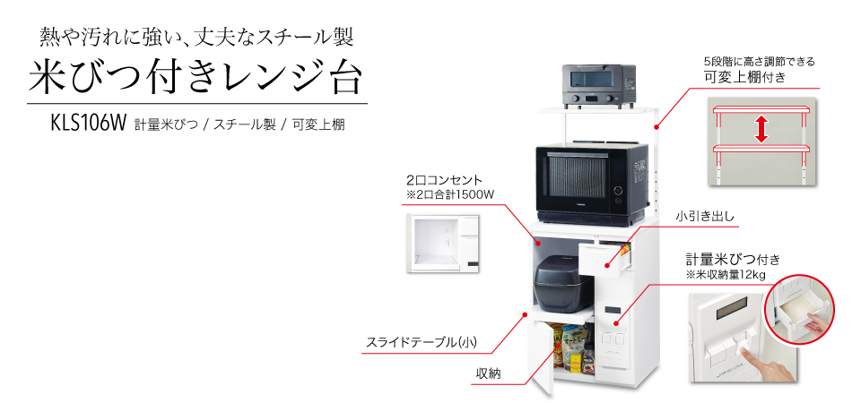 本体、天板、スライドテーブル(小):鋼板(樹脂焼付塗装) 上棚 : 鋼板(樹脂焼付塗装) 米びつ前面板、米受け、扉、小引き出し:ポリスチレン 天板モール : ポリスチレン 脚:ポリプロピレン |