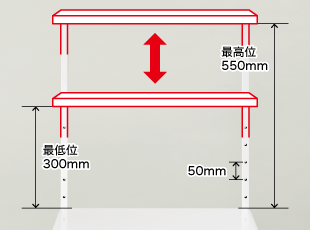可変上棚付き 上棚板は300mmから550mmまで、50mm刻みで高さを調節できます。
