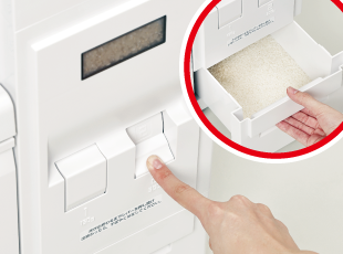 使いやすい計量米びつ付き ※米収納量:12kg 計量米びつはワンプッシュで簡単に計れる、2レバー式(1合・2合)を採用。