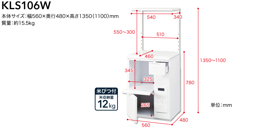 | サイズ / 質量 | 幅560×奥行480×高さ1350(1100)mm / 約15.5kg |