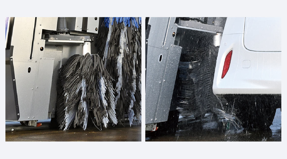 車両下部やタイヤ周りを洗浄するロッカーブラシは、幅広間口に合わせて新たに設計。拡大した間口でも車両を美しく洗い上げます。