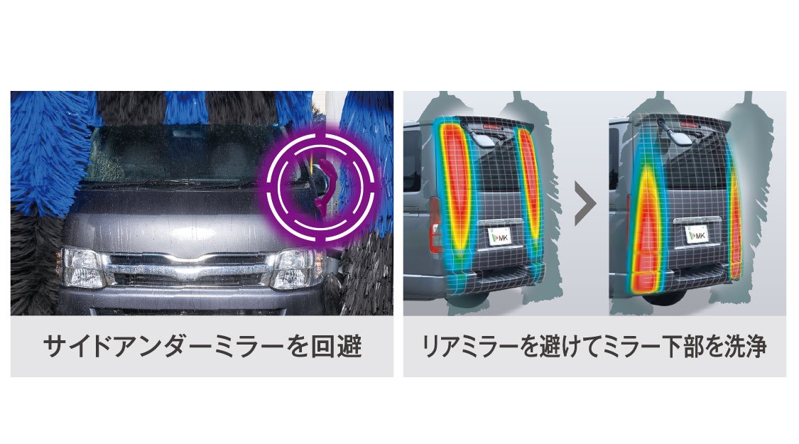 サイドアンダーミラー装着部は最小限の動きで回避し、安全で洗い残しの少ない洗車を行います。