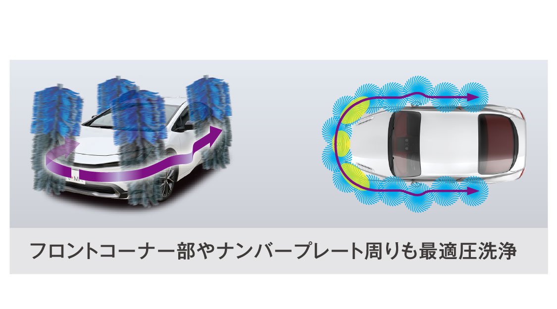 超音波を活用した独自のスキャンシステムを搭載。洗車機の左右から車両にかけて超音波を発信し、反射して帰ってくるまでの時間で車両側面の位置と形状をミリ単位で測定します。洗車ブラシや乾燥ノズルを適正なポディションへ導きます。片寄り停車や斜め停車時の安全性、洗浄性、乾燥性が一段向上します。