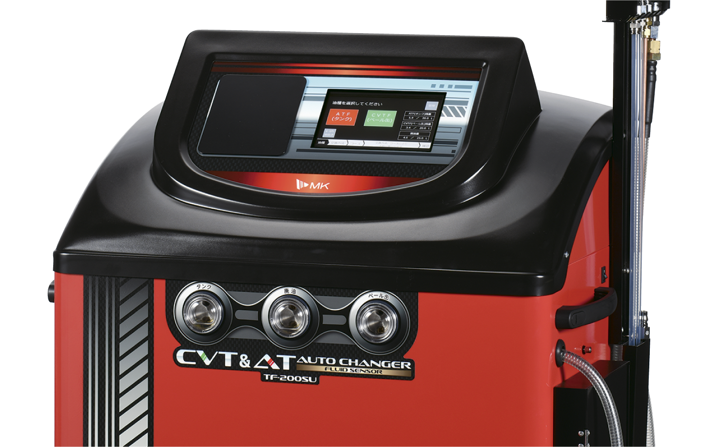 TF-200SU大型タッチパネル搭載モデル。上抜き・下抜きを問わず幅広い⾞種のフルード交換に対応し、全⾃動で効率的に作業可能です。