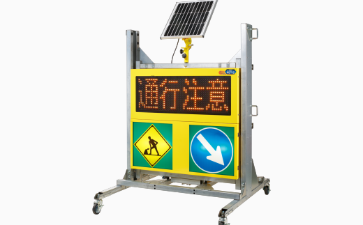 <NETIS登録製品> 登録No. KT-230065-VE ソーラー式で環境にやさしい工事用LED表示機。 カラー表示で標識に準じた配色で注意を促します。